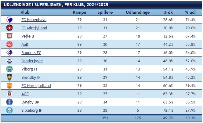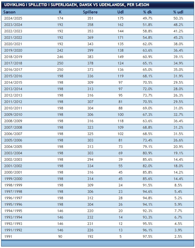 Ifølge mediet balancerer statistikken netop nu på en knivsæg, for mens udenlandske spillere tegner sig for 50,3 procent af spilletiden i de første 174 superligakampe i denne sæson, så fører de danske spillere fortsat statistikken, hvis man tæller antallet af spillere, der har fået spilletid i denne sæson, men det er tæt: 176 danskere mod 175 udlændinge.