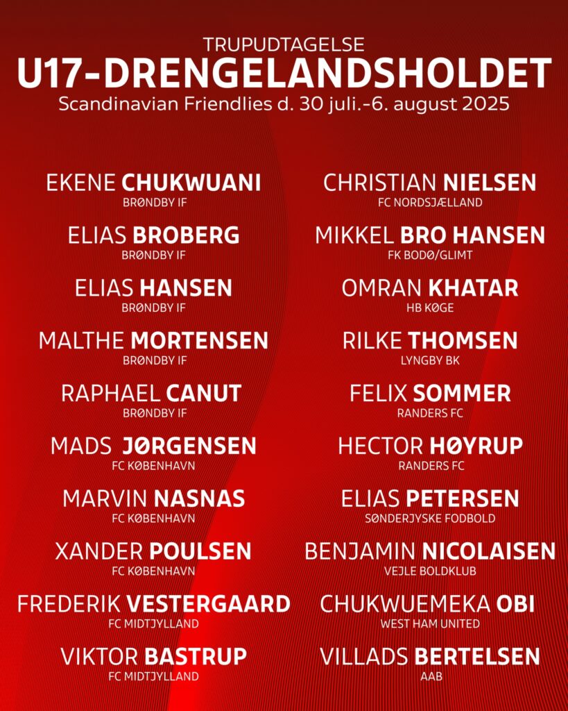 Derudover er også Chido Obis bror, Chukwuemeka Obi, som netop har underskrevet med West Ham, med i truppen, som tæller fem navne fra Brøndby IF's akademi.