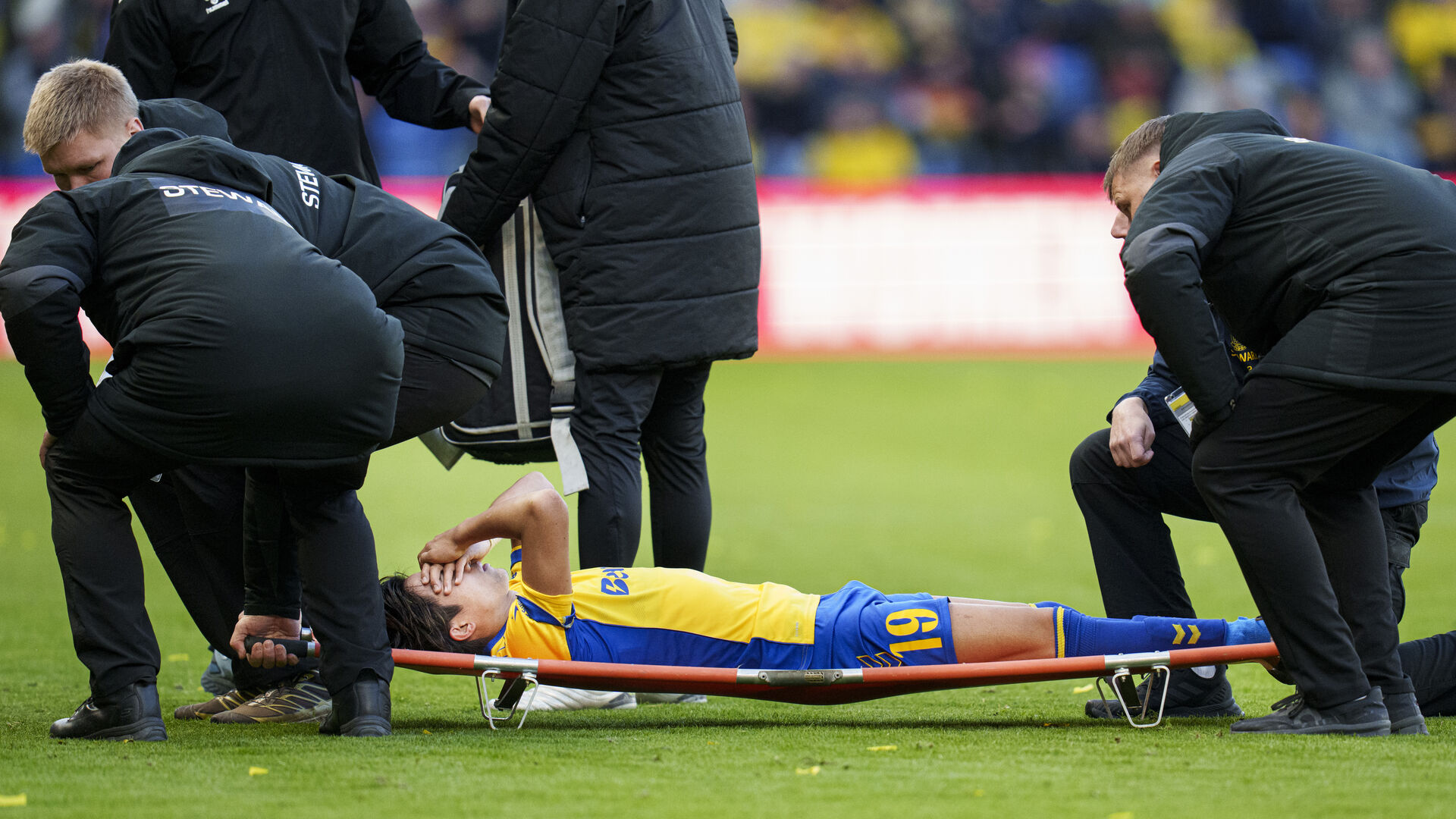 Det stod også så slemt til, at den japanske Brøndby-spiller måtte fragtes på en båre ud af banen.