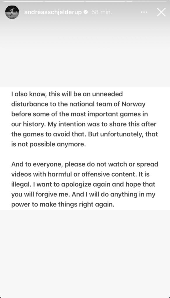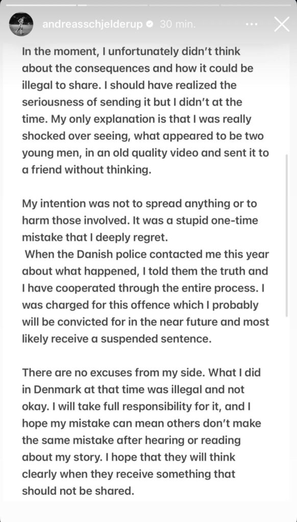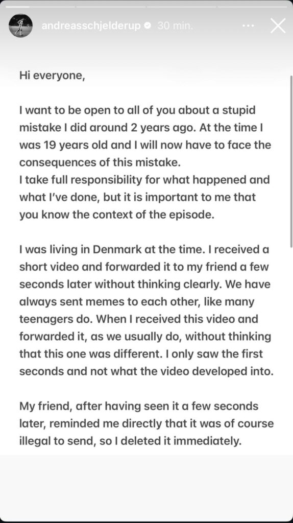 Herefter beskriver den 21-årige kantspiller, at han modtog en video, som han uden at tænke sig om videresendte til en ven. Vennen oplyste efterfølgende Schjelderup om, at det var ulovligt at videresende videoen, hvorefter den daværende FCN-spiller slettede videoen, skriver han i opslaget.