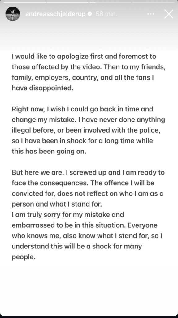 - Jeg tager fuldt ansvar for det, der er sket, og det jeg har gjort, men det er vigtigt for mig at fortælle om konteksten for situationen, beskriver Andreas Schjelderup i en story på sin private Instagram-profil.