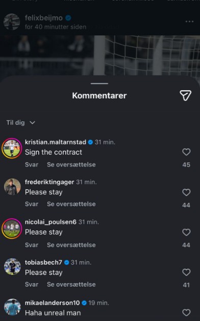 Sådan lyder det - helt kort - fra blandt andre Tobias Bech, Kristian Arnstad, Nicolai Poulsen og Frederik Tingager i kommentarerne til Felix Beijmos fejringsfoto.