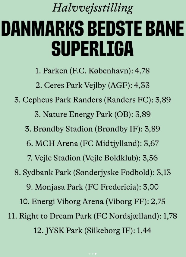 - Dykker vi ned i tallene kan vi se, at gennemsnittet for Superligaens hybridbaner er 3,84, mens det til sammenligning er 3,06 for ligaens to græsbaner og bare 1,61 for de to kunstgræsbaner, skriver Spillerforeningen på sin hjemmeside.